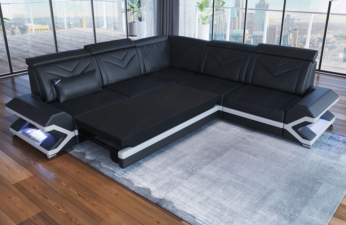 Get this comfortable designer sofa, which is also available with an integrated sleeping function upon request. You can choose the covers from various materials, including faux leather, genuine leather, buffalo leather, or a combination of genuine and faux leather. Design your couch individually according to your taste, including the color: opt for classic black, white, or gray, or choose from a variety of other colors. For a special accent, you can select an additional contrasting color.
