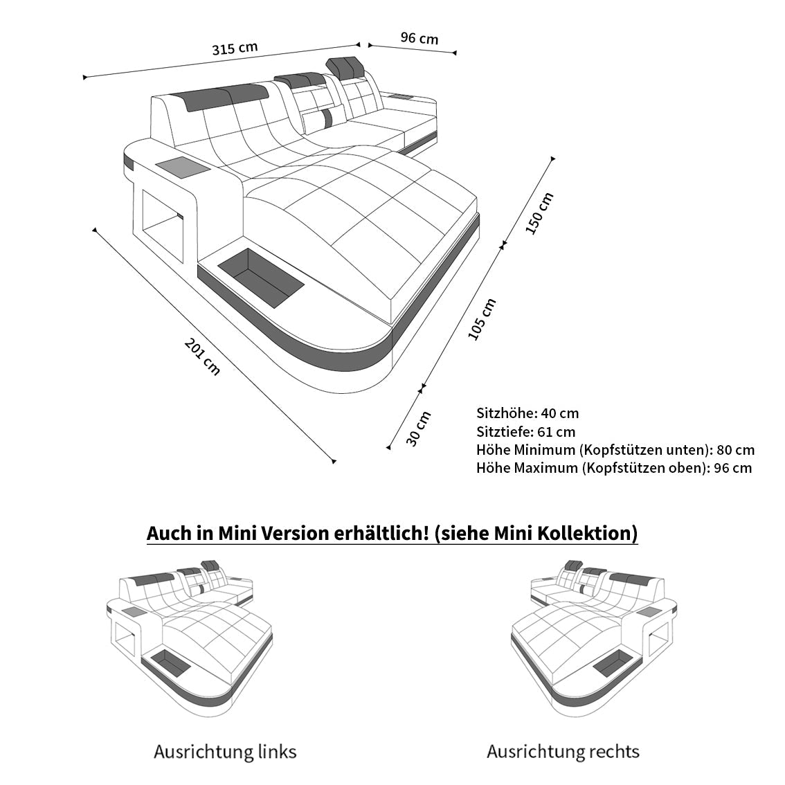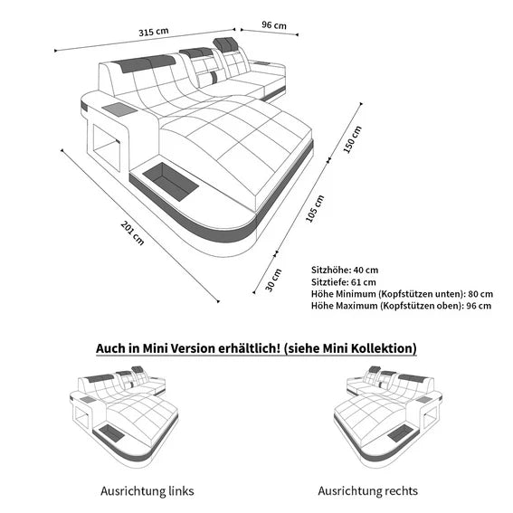 Even in the compact corner sofa version, the Konstantin model offers more than just a regular seat. The curved reclining surface ensures a distinctive design that lives up to its name. There are also many practical extras: adjustable headrests, storage space in the sides, and armrests with shiny shelves. The soft curves and stylish decorative stripes create a harmonious, modern overall impression. At night, the integrated LED lighting in the side panels of the sofa creates a cozy and elegant atmosphere in your living room.