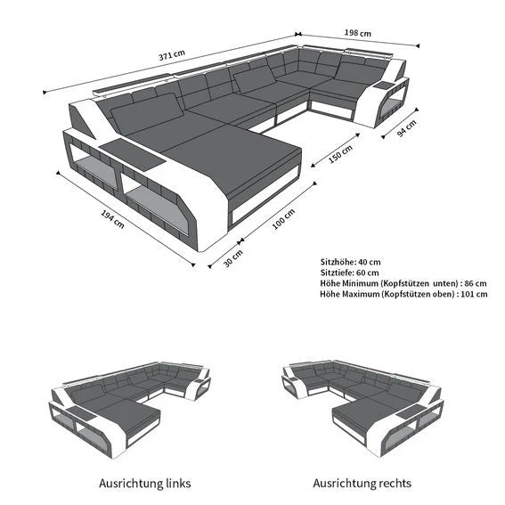 For all those who value a lot of space: the Italian Aroba designer sofa. Comfortable seating and reclining surfaces, along with many thoughtful details such as integrated lighting and elegant storage areas, make this sofa a real eye-catcher. With the numerous design options, you now have even more freedom to realize your ideas and your individual style. Rayy offers you numerous options, of course at no additional cost. The upholstery consists of a combination of high-density polyether cold foam, reinforced by Bonell springs. This upholstery technique emphasizes the modern shape of the sofa and ensures that you can always sit comfortably on your living area and enjoy a relaxed evening.