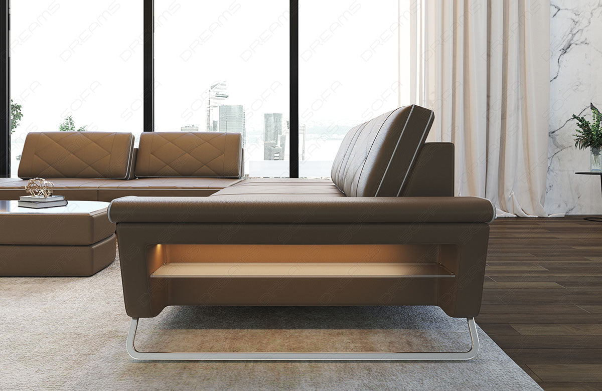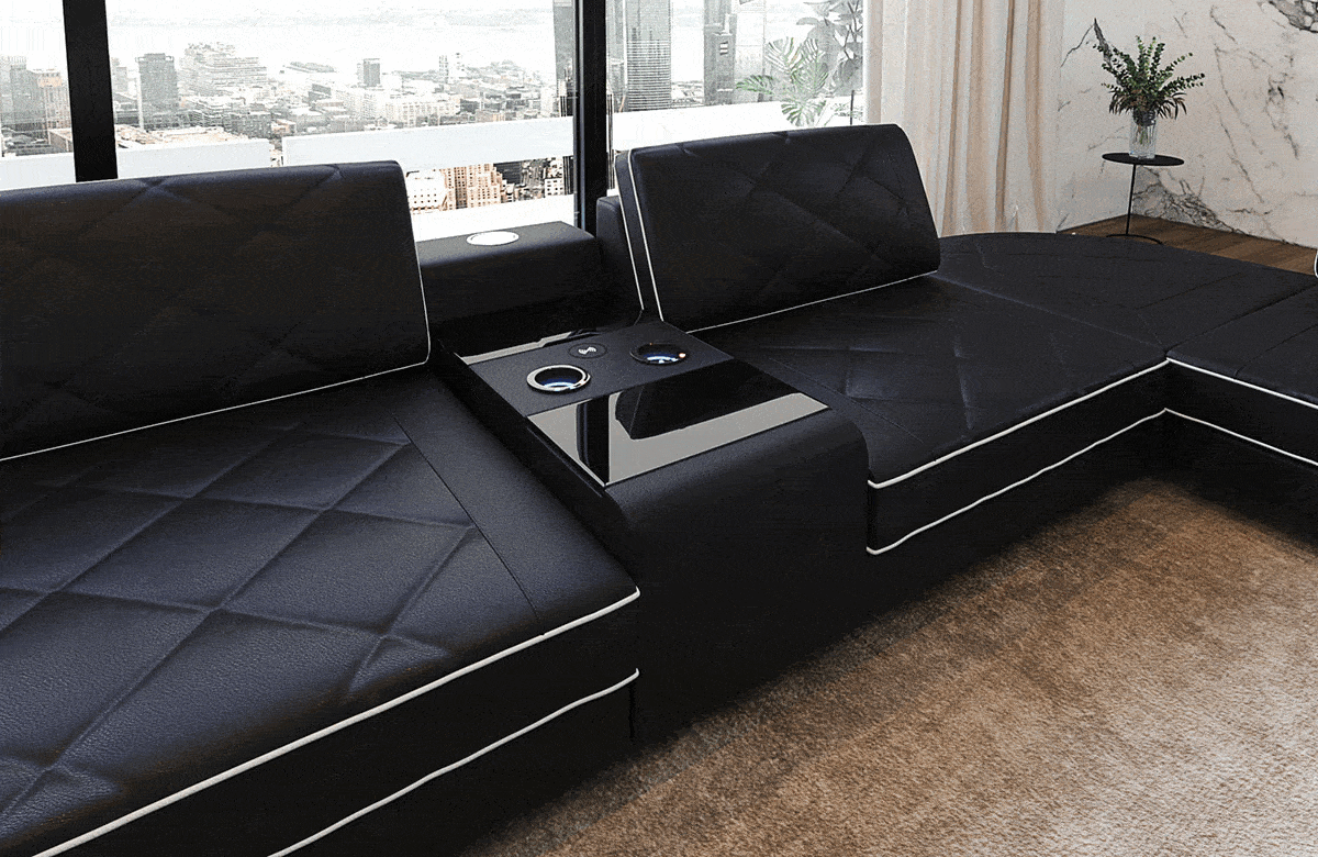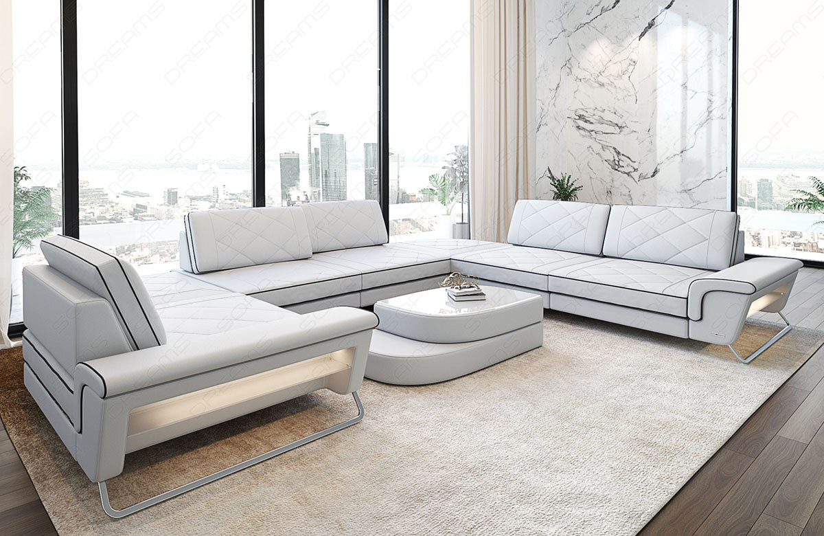 The luxury U-shaped leather sofa living area Otello offers 5 comfortable seats and 2 padded corners. The seats offer enough space to comfortably accommodate several people. All seats are equipped with an adjustable seat depth, allowing the backrest to be moved forward and backward as desired. The armrests feature a glass shelf and color-changing LED lighting, which is controlled by remote control. The sofa frame is made of robust, crack-resistant beechwood. The comfortable seating is supported by the Bonell springs and the layered polyether cold foam filling.