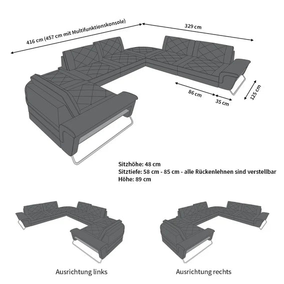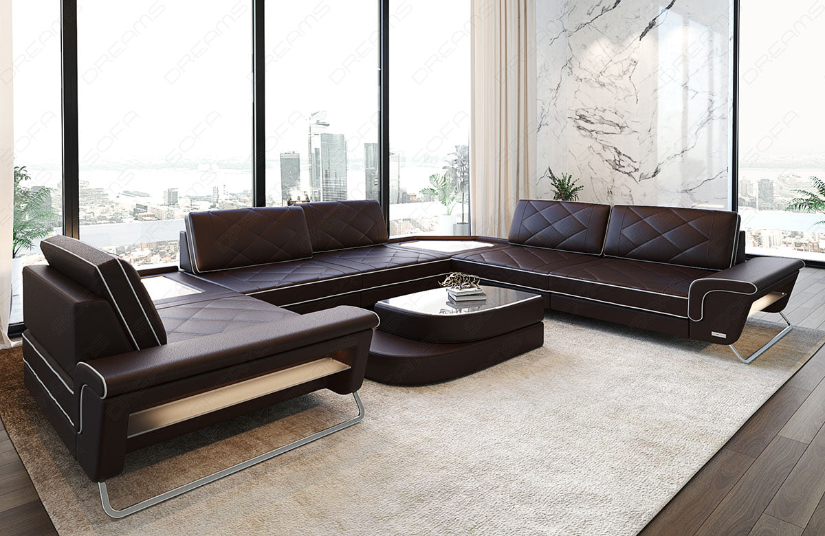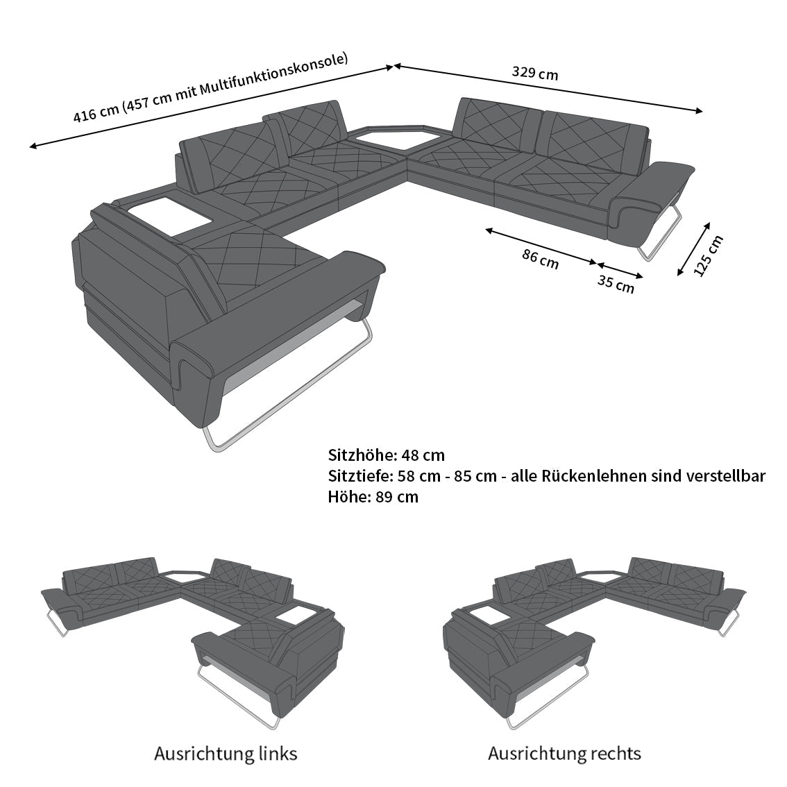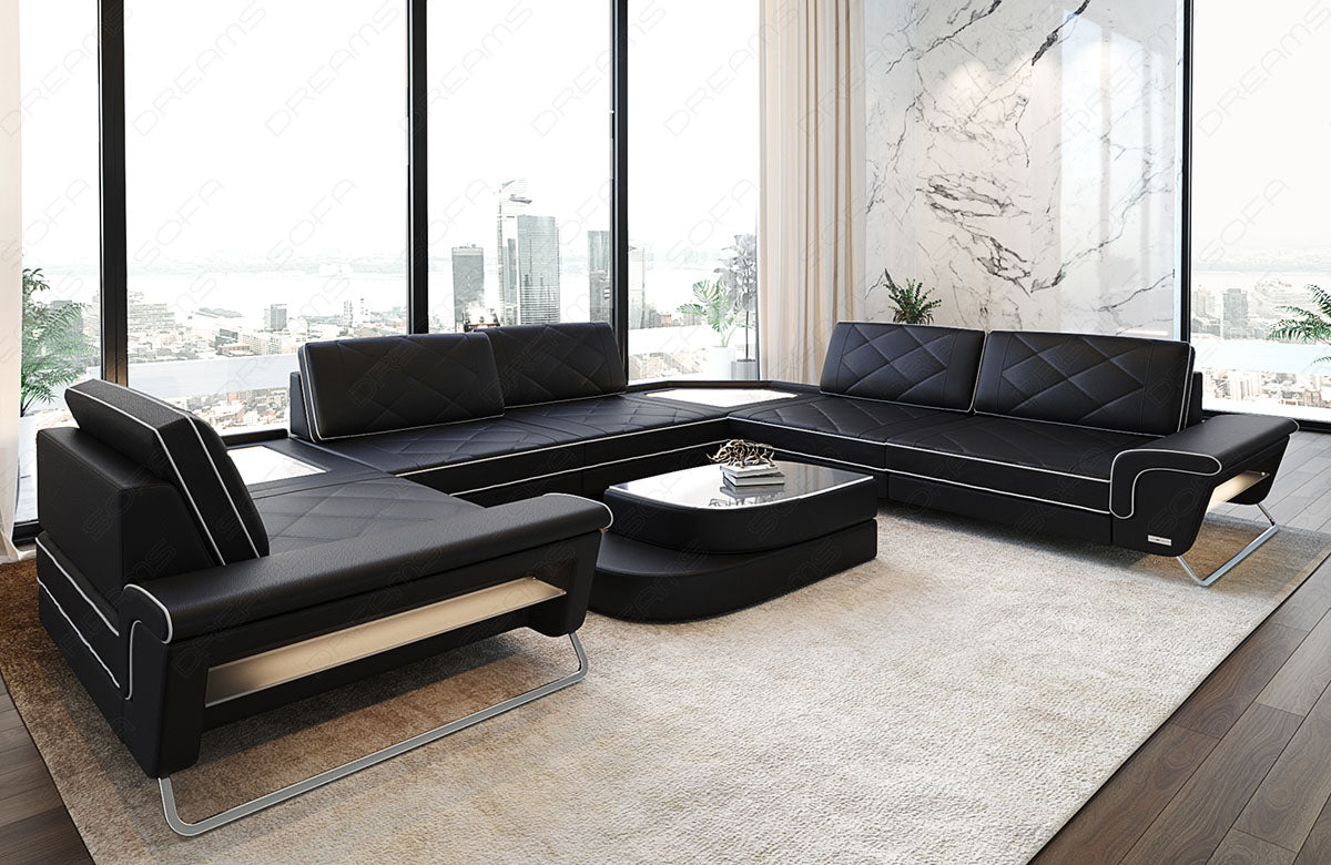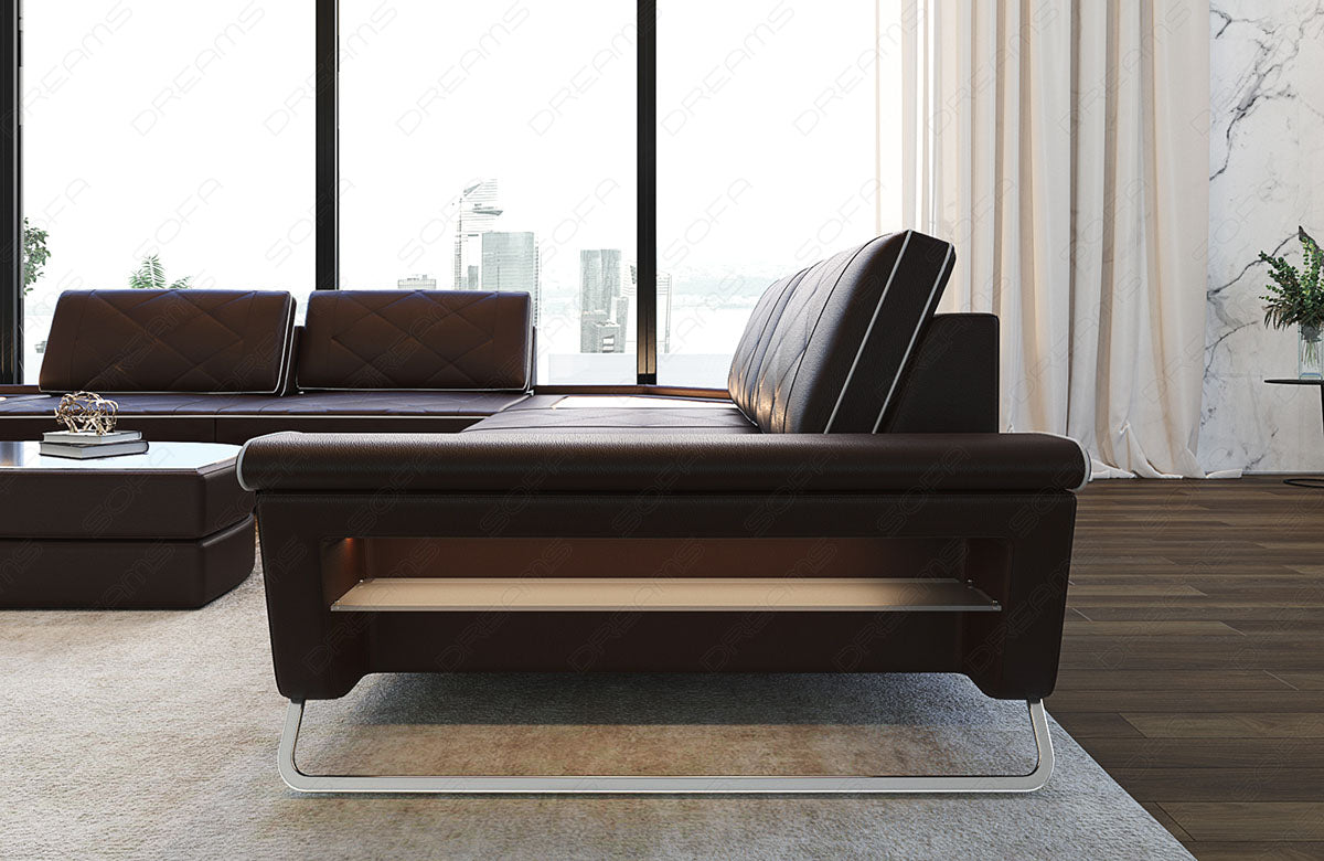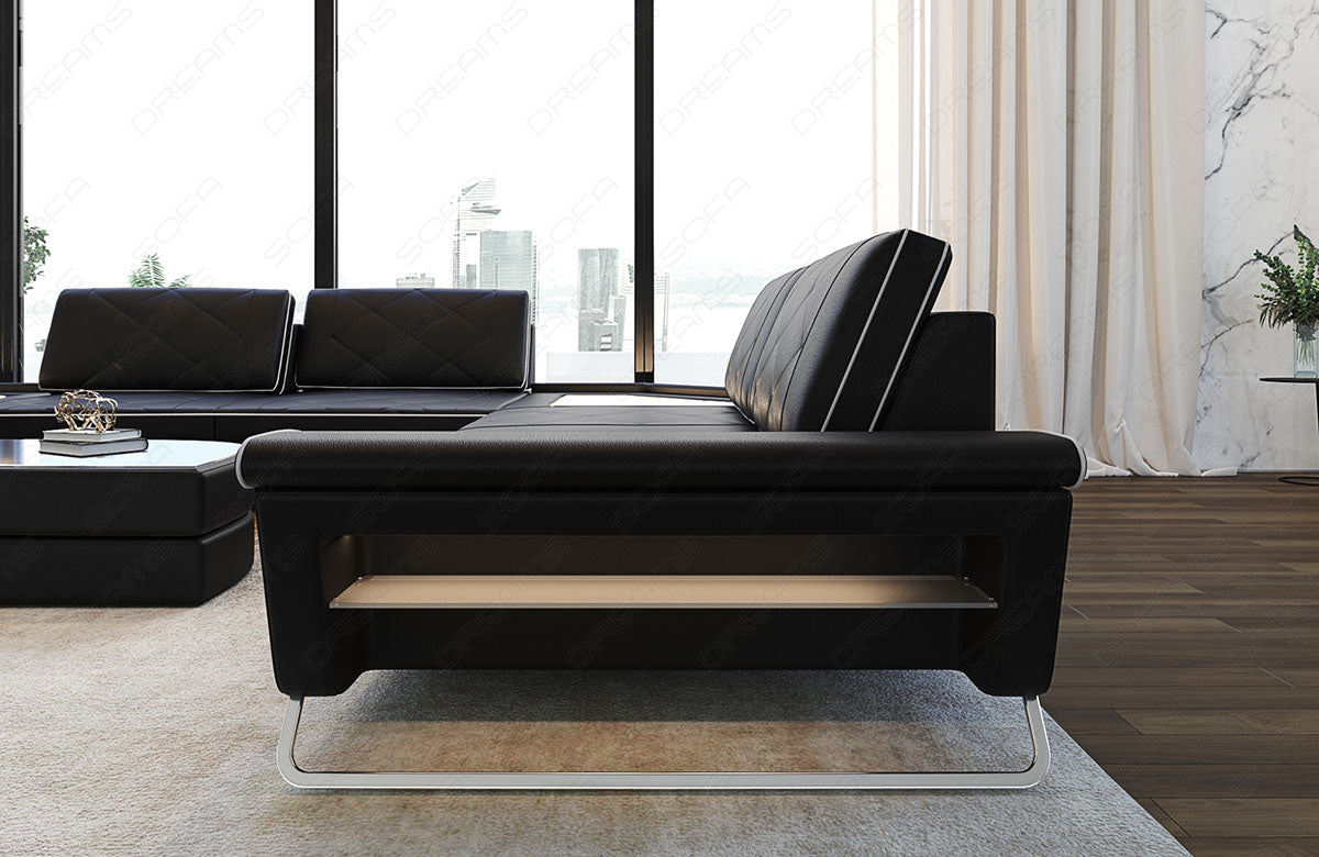 The Polaris designer leather living area in a U-shape offers five seats and two illuminated corners with a glass shelf. The seating areas offer enough space for several people to sit comfortably on this luxurious leather sofa. All seats feature manually adjustable seat depth, allowing the backrest to be moved forward or backward as needed. The armrests feature a glass shelf and color-changing LED lighting, controlled by a remote control. The sofa frame is made of robust, shatter-resistant beechwood. The high level of seating comfort is achieved through the Bonell springs and the multi-layered polyether cold foam filling.