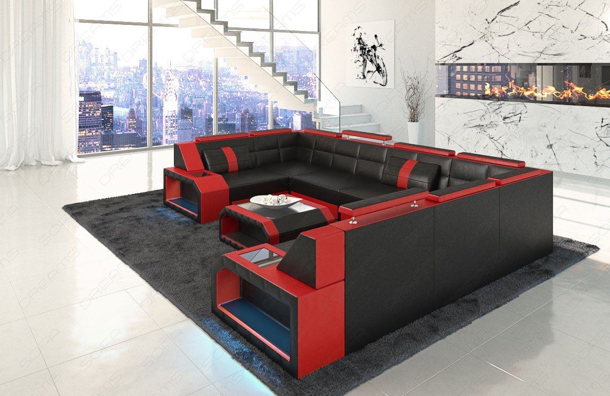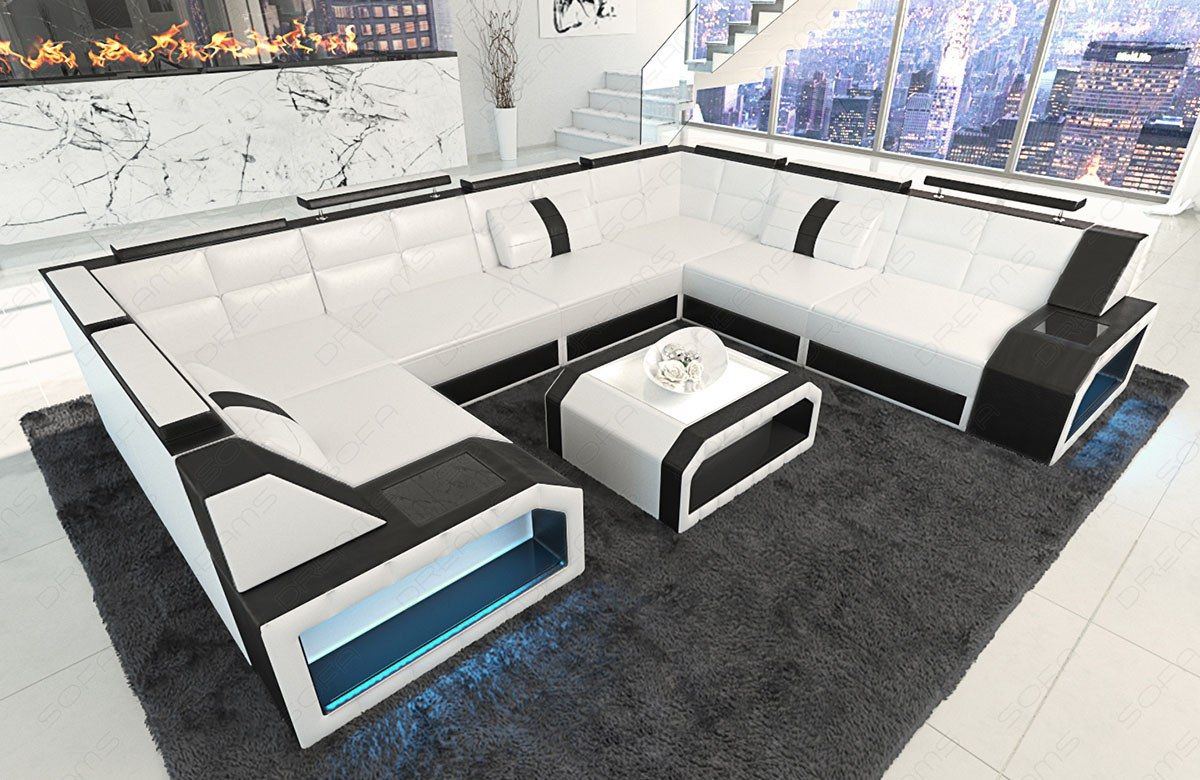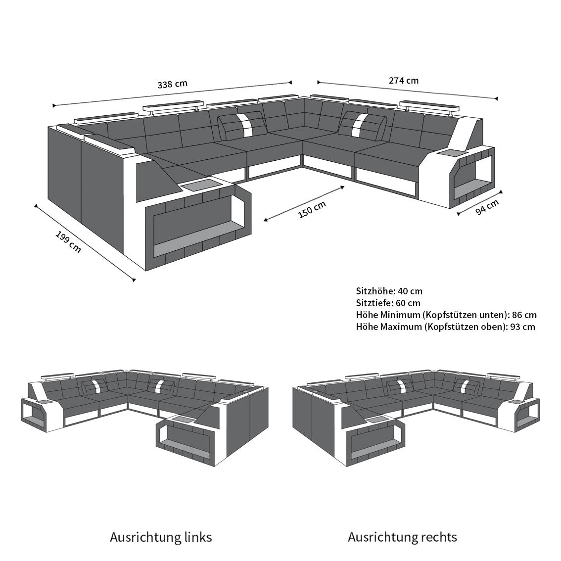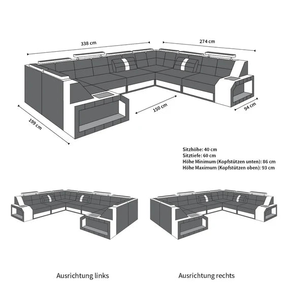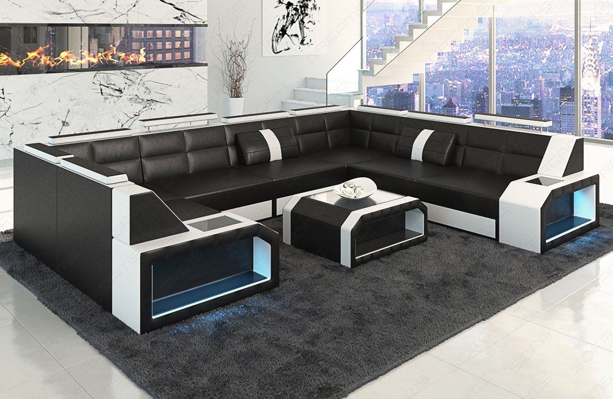 Modern leather sofa with integrated LED lighting. This designer sofa is available in a variety of colors. You can order the Pesaro living area in various finishes. Choose between faux leather, real leather, buffalo leather, or a combination of faux and real leather. The choice is yours. Design your dream sofa exactly as you imagine it. You can also choose the color: black, white, brown, beige, or another color. With us, you can realize your wishes.