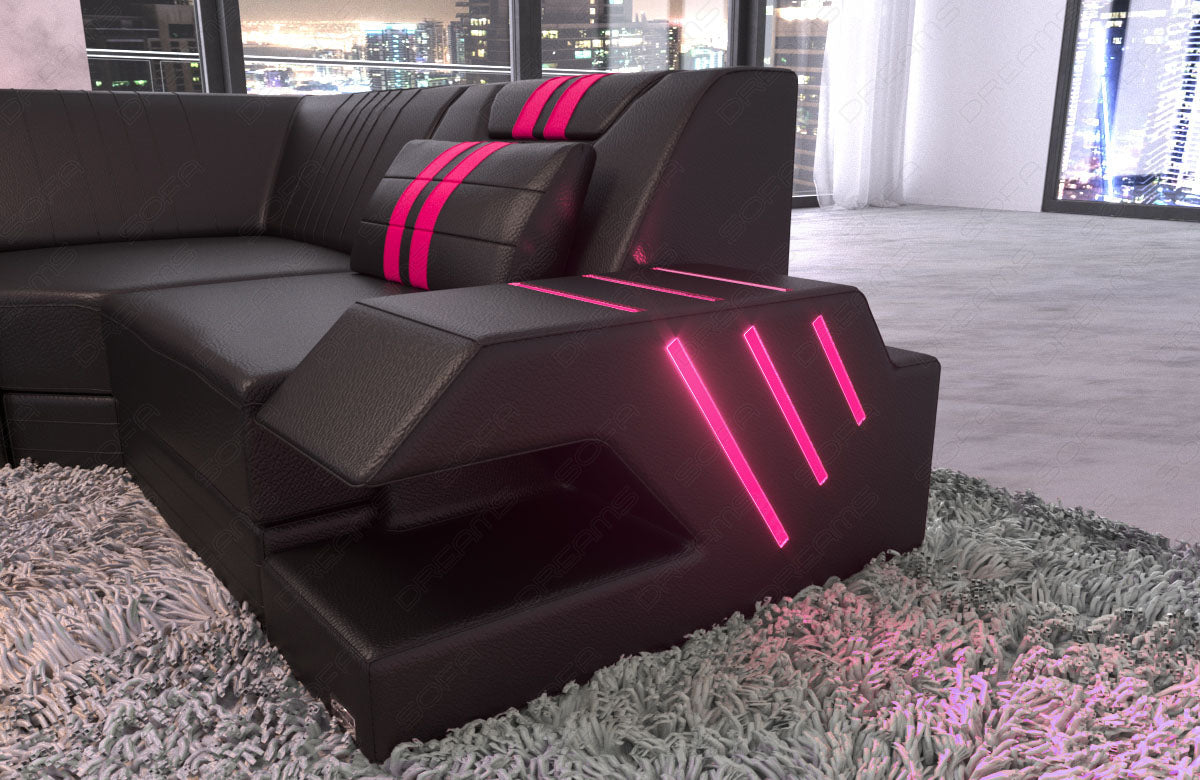 This dark grey Naomi sofa with vibrant blue lit storage combines utility with ultra modern aesthetics. Perfect for those who love a bold and practical home setup.