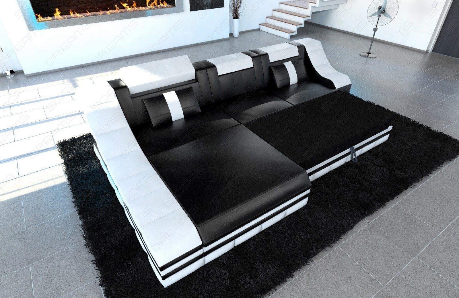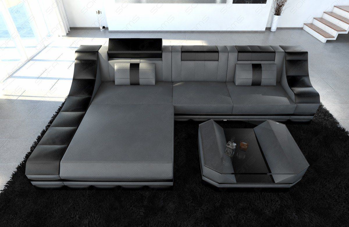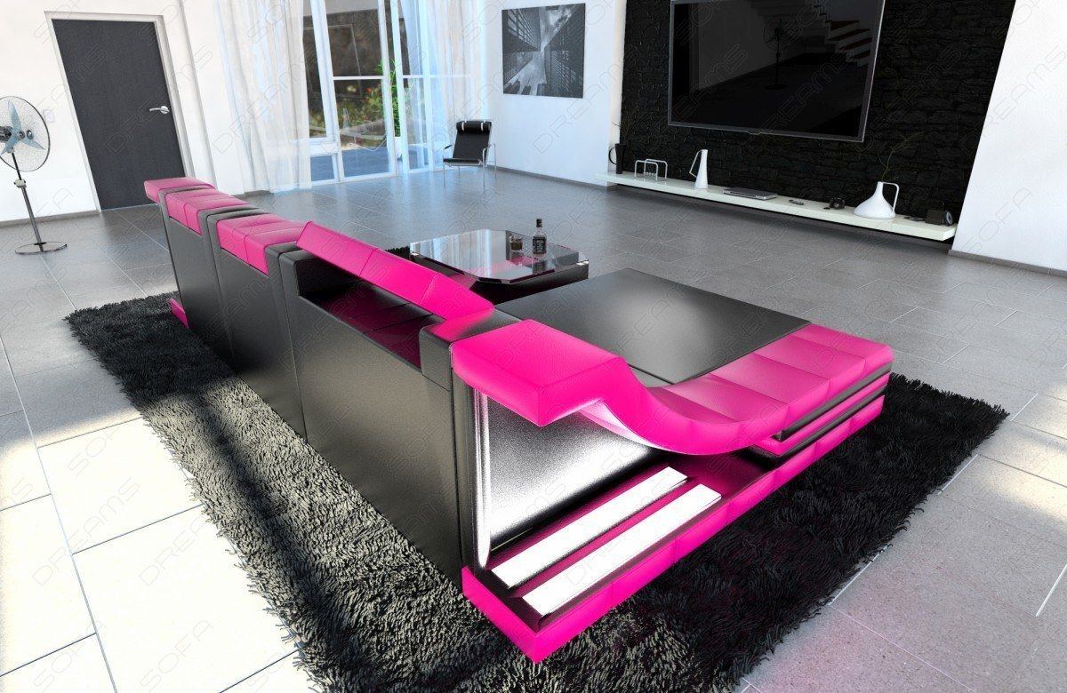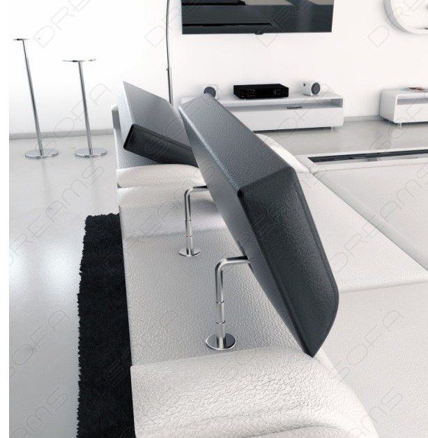 The Temoni leather sofa is characterized by its striking, curved armrests and forward-leaning reclining surface, giving the sofa a dynamic and flowing appearance. The narrow decorative stripes on the sides of the sofa further emphasize this impression. The headrests of the designer sofa are adjustable in both height and angle, ensuring a comfortable seating position for people of all sizes. You'll also find practical storage space under the armrests. Integrated LED lighting with color change is featured on both sides of the sofa. With the included remote control with touch wheel, you can adjust the lighting to suit your mood.