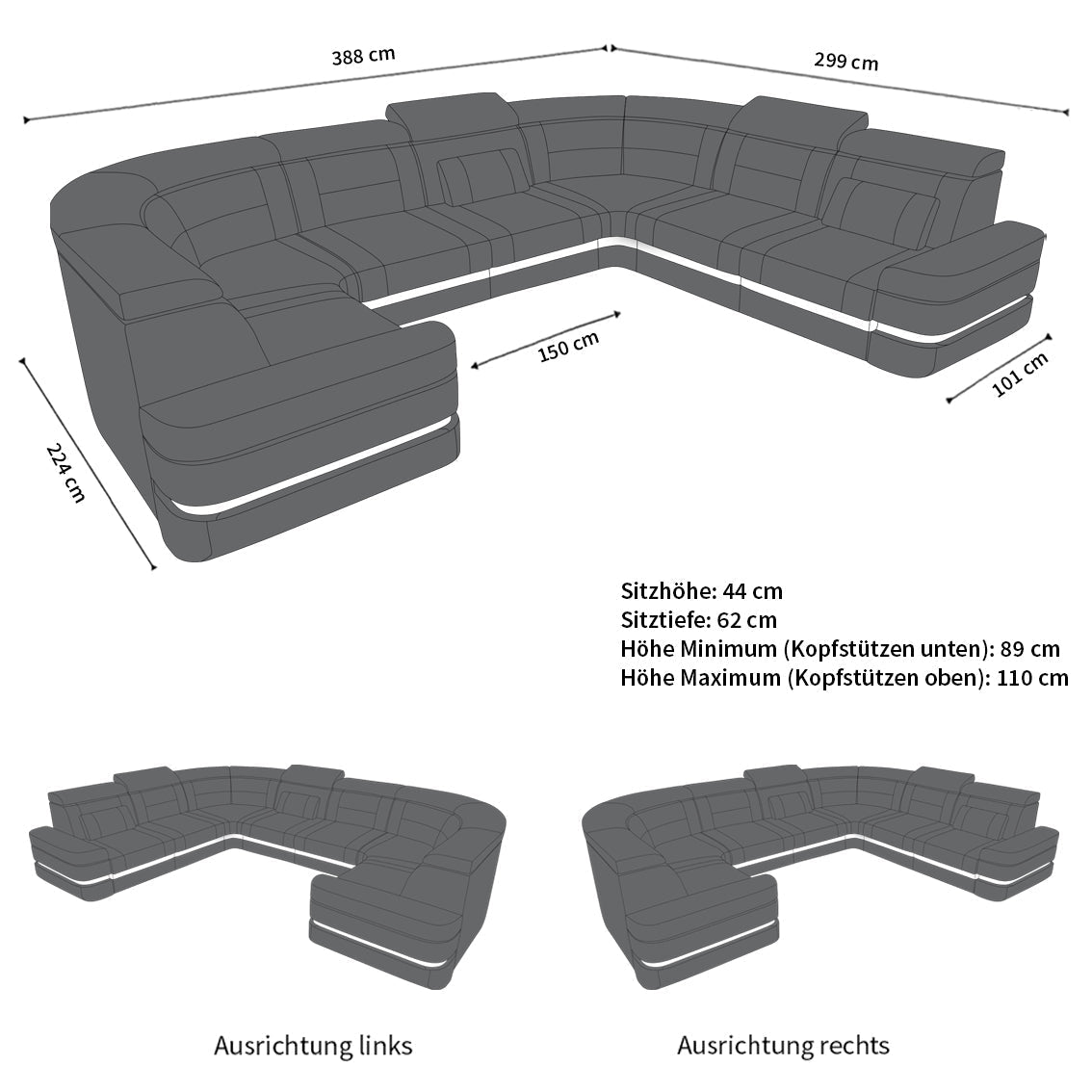 The generous U-design offers space for at least six people. You can choose the orientation of the long side as desired. The stable frame of the living area is made of high-quality beechwood, which is particularly resistant to cracking. Thanks to the Bonell springs, deformation caused by long periods of sitting is prevented. You can also incorporate your personal preferences in terms of design. The choice is yours. Choose between four high-quality upholstery fabrics: faux leather, genuine leather, buffalo leather, or a combination of faux and genuine leather. You can also choose the cover color to suit your taste. From classic colors like white and black to vibrant tones like red, orange, or pink, there's something for every taste. If you prefer a subtle color scheme or want to add a touch of flair, you can also choose the sofa in various main and accent colors. You are also free to choose the orientation of the long side (left or right). Innovative additional functions, such as the optional USB port with reading lamp, stylishly round off the overall look of the living area. The matching coffee table for your sofa is also available in our shop.