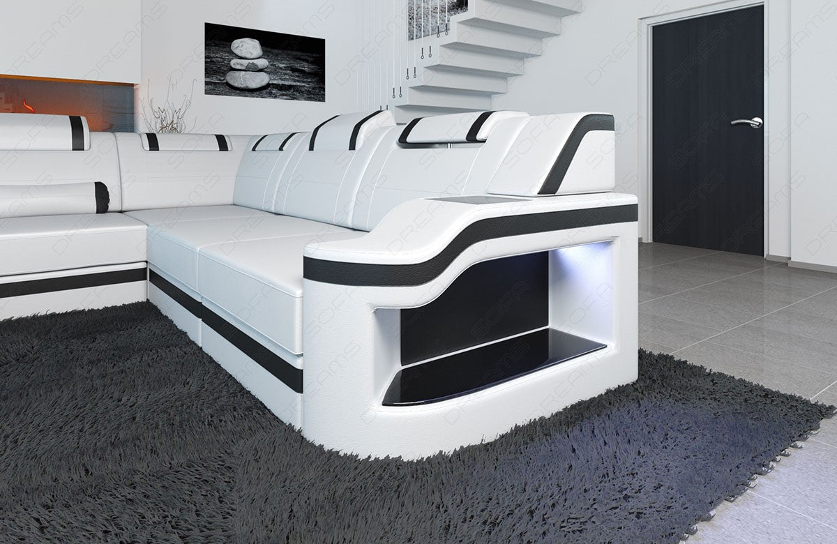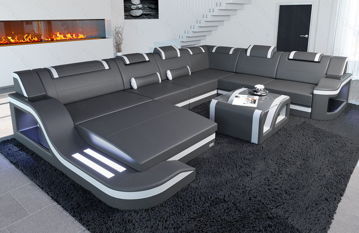 The design of the Paloma sofa also sets high standards. Contrasting stripes, rounded corners, and curved armrests give the sofa a modern, elegant look. This is particularly emphasized by the color-changing LED lighting. For your individual leather couch, we offer a selection of covers, including both durable and easy-care faux leather and luxurious buffalo leather – an exceptionally soft material for maximum comfort. Opt for a high-quality leather sofa and order the Paloma XXL sofa for discerning users.