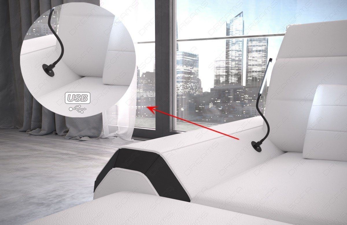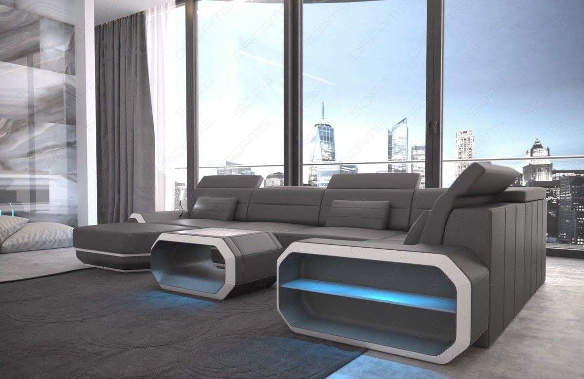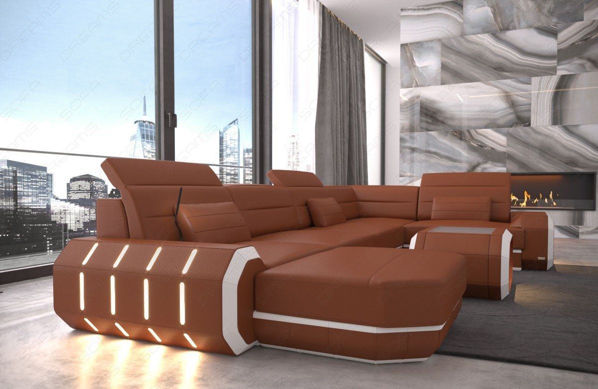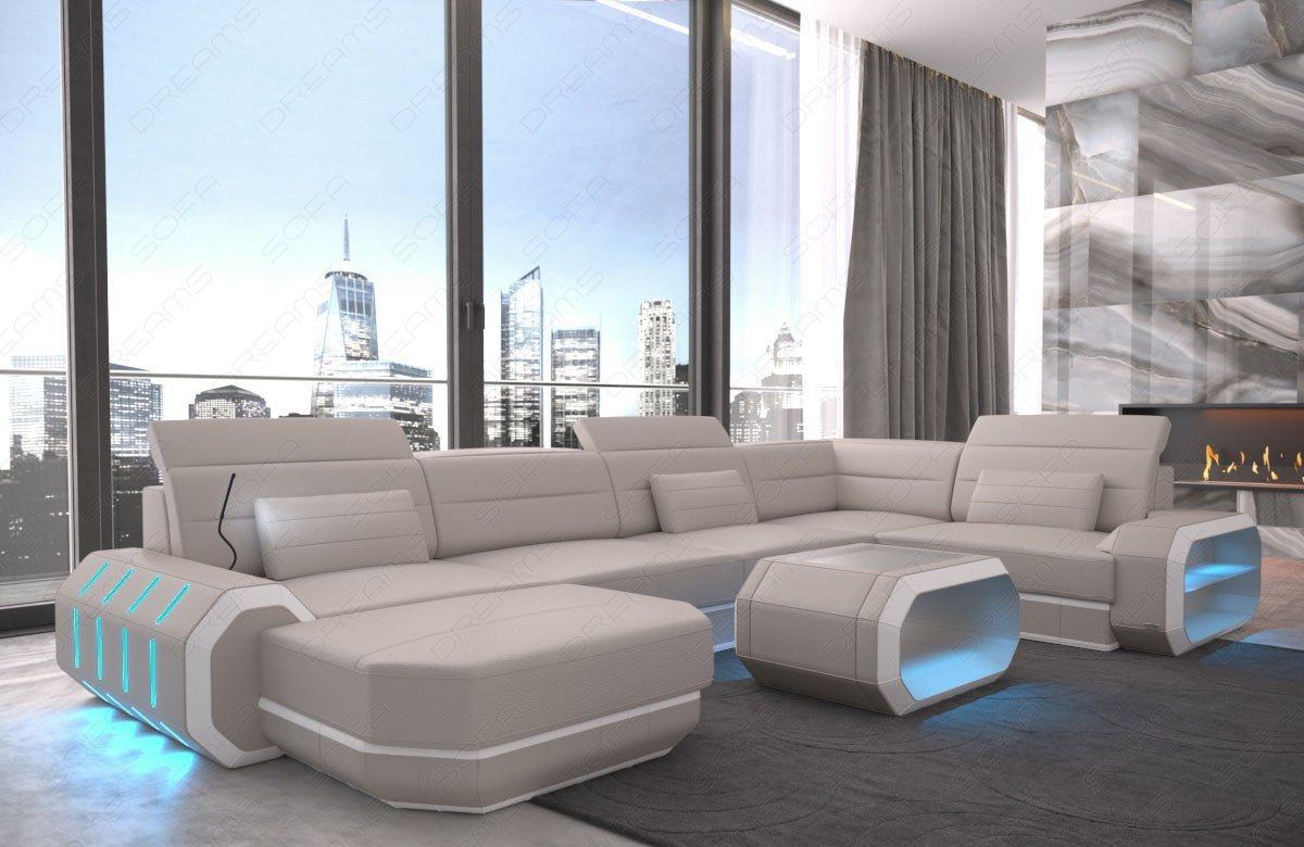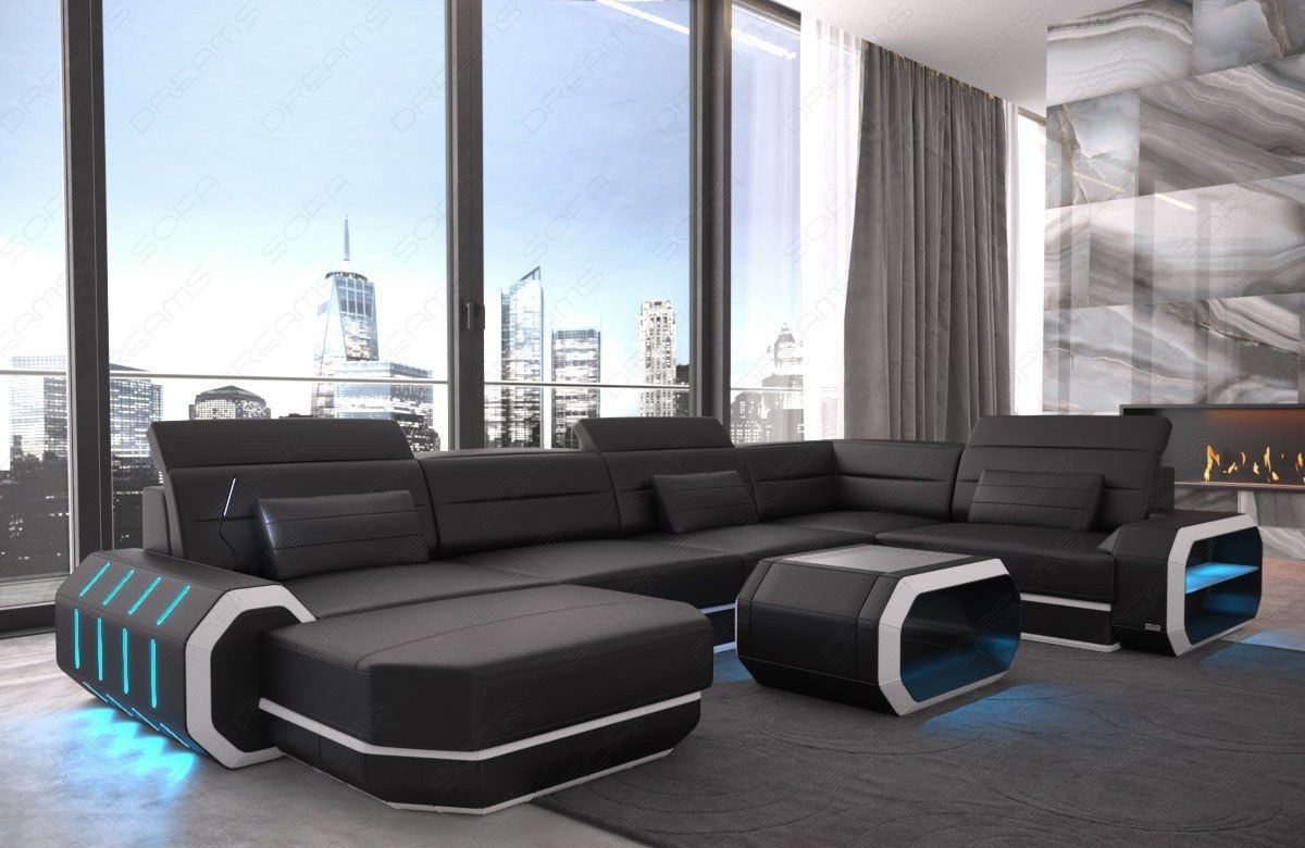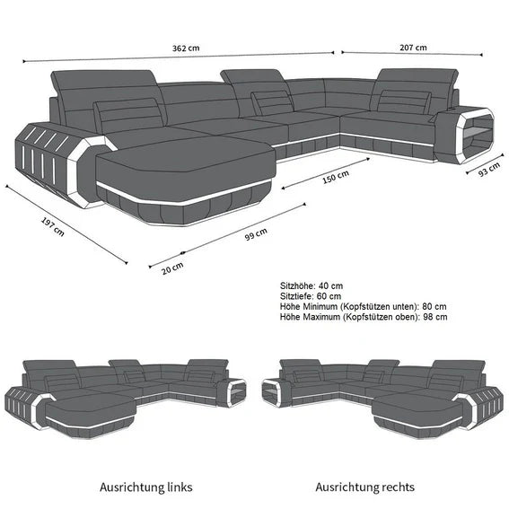 A stylish, modern design and high-quality leather covers combine perfectly. Do you also want plenty of space for your family and friends? Our U-shaped Rome living area meets all requirements. With generous reclining areas and numerous comfortable seats, it is ideal as a centerpiece for social gatherings. The LED lighting integrated into the sides also adds a special touch. With the touch wheel remote control, you can change the light color with a single movement – a real highlight at any celebration. Incidentally, the Rome leather sofa is available in various cover types and colors.