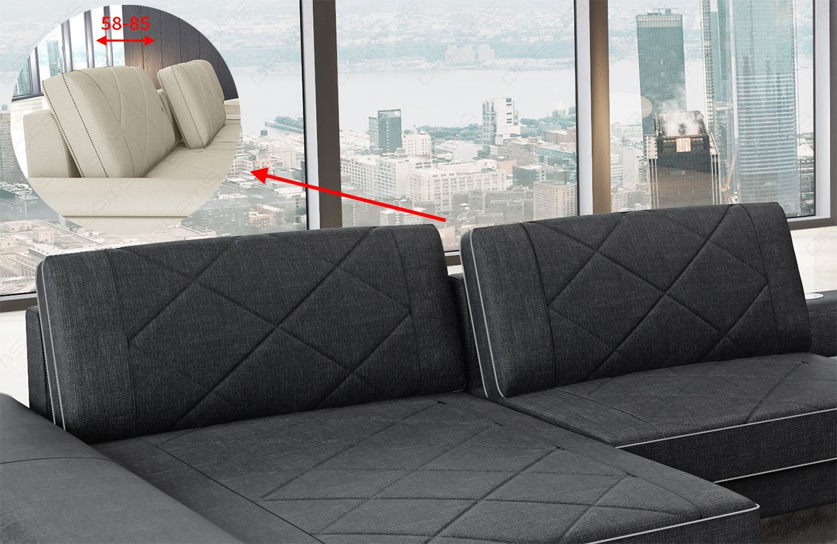 A special highlight are the depth-adjustable backrests. These can be manually adjusted forwards and backwards from 58cm to 85cm with a simple movement of the hand. This allows all five backrests of the XXL sofa to be adjusted to your personal needs. Whether tall or short, young or old: with the adjustable backrests of the Rayy living area, everyone can find their ideal sitting and lying position. The spacious ottoman, measuring 197cm long and 86cm wide, offers the perfect place to relax after a busy day. Combine the sofa with an upholstery cover tailored to your needs. The Hugo cover is particularly durable thanks to its vertically woven fiber strands. The textured surface of the fabric provides additional comfort and is particularly easy to care for. If you are looking for a cover that offers the benefits of a leather sofa, such as easy cleaning, but retains the soft surface of an upholstered sofa, then the Mineva fabric with Easy Clean technology is the ideal choice. For our customers who desire a premium upholstered sofa, we recommend the fine woven Sun Velvet fabric, which impresses with its velvety soft surface. This fabric is available in many colors from Rayy.