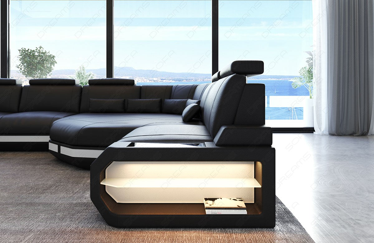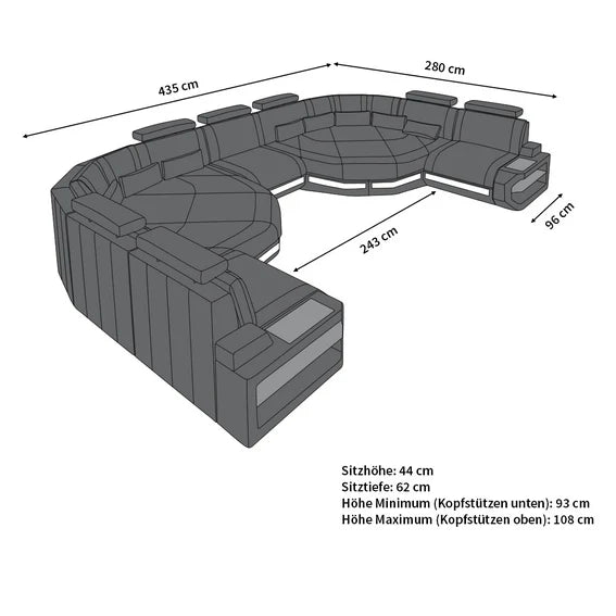 The Rayy XXL leather living area in U-shape will become the stylish and preferred centerpiece of your living area. The two spacious corners offer comfortable reclining areas for relaxation and well-being. The sturdy frame is made of high-quality beechwood. The armrests include storage areas equipped with LED lighting, which can be conveniently controlled via a touchwheel remote control. A polyether-based cold foam filling and Bonell springs ensure high seating comfort and prevent unpleasant deformation of the seat surfaces. The front sides are finished with decorative panels in a complementary color. The standard version of this elegantly designed living area features a premium UV-resistant synthetic leather cover with a soft textile back and a fine leather grain. Additional options include a mix of real and synthetic leather, genuine Italian nappa leather with light pigmentation to protect against dirt, and exclusive buffalo leather for particularly luxurious seating comfort. The living area can be expanded as desired. USB ports and a matching coffee table are optionally available.