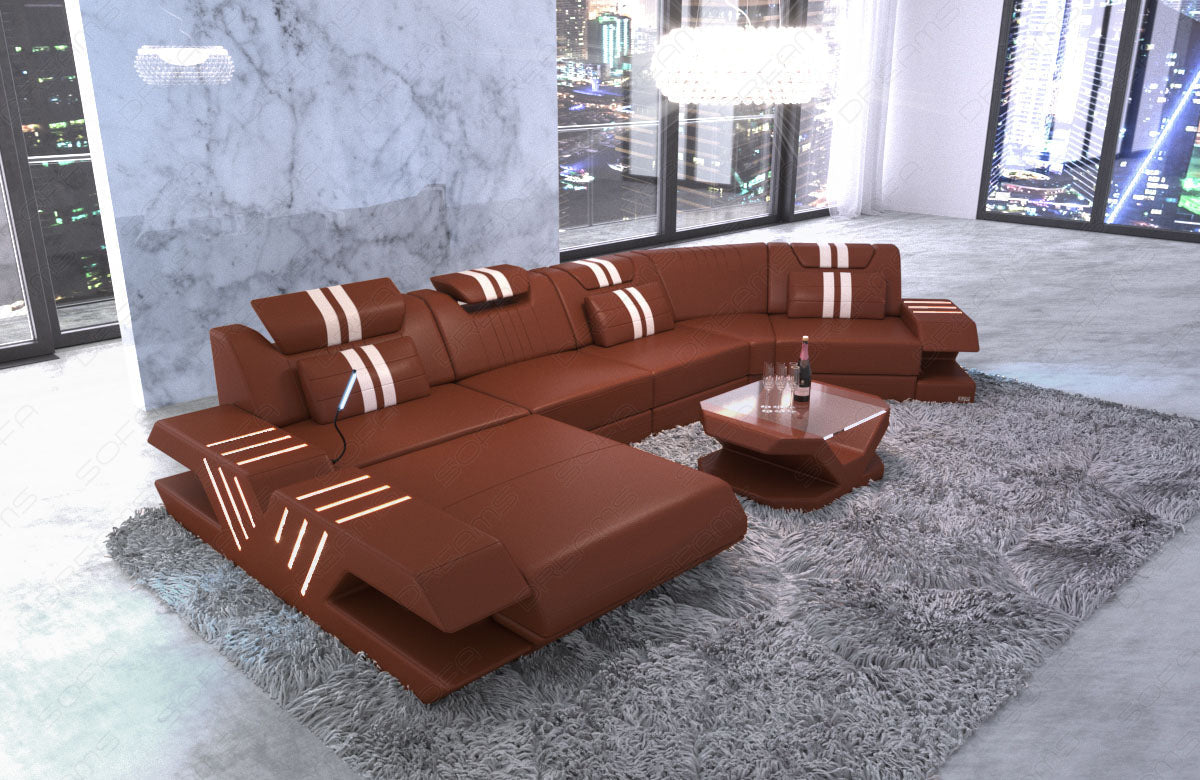 The 'Venezia' leather sofa in C-shape with integrated LED lighting is an exclusive and modern piece of furniture that combines style and functionality.