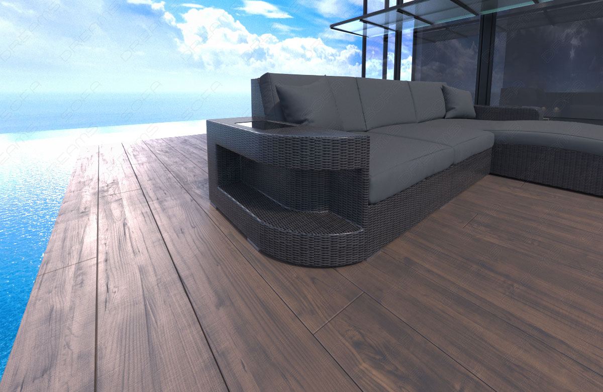Summery flair for your home? Bring a touch of Mediterranean lifestyle to your living room or patio with the Konstantin L-Shaped rattan sofa and gray cushions. Where you place this sofa is entirely up to you. The polyrattan from which this model is made is particularly resistant to moisture and temperature fluctuations. It is also UV-resistant. These properties allow the sofa to be left outside even in inclement weather. Polyrattan has the same attractive appearance and light weight as natural rattan. The sofa features a modern L-shape, which not only impresses with its clean lines but also boasts a generous reclining area. It is also equipped with integrated LED lighting. You will receive the rattan sofa with the reclining area/ottoman on the right side (as shown in the picture).