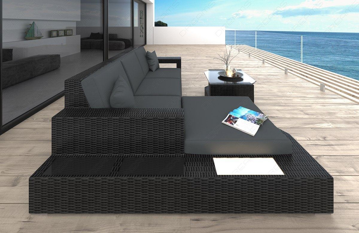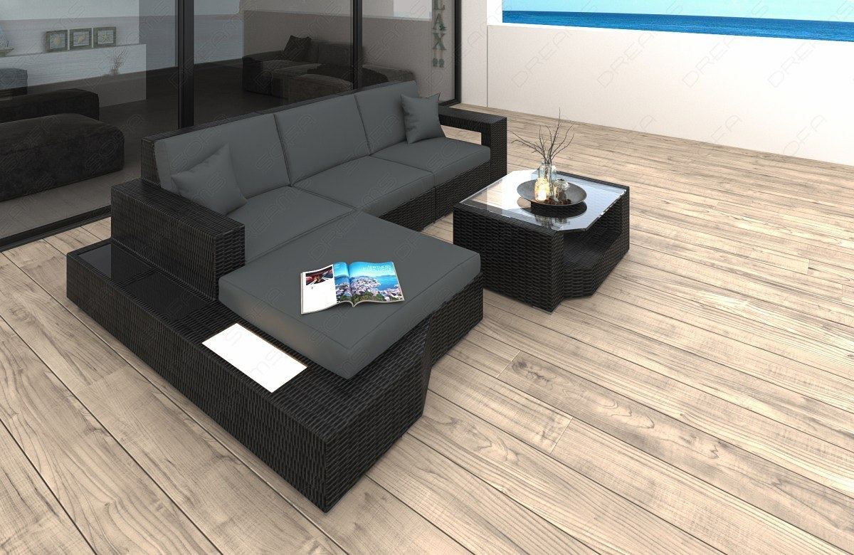 The Miranolo L-shaped rattan sofa with gray cushions brings a holiday feeling into your home. Whether you place it on the terrace or in the living room, the poly rattan is reminiscent of tropical cocktails under palm trees and the soothing sound of the sea. It is far more durable than natural rattan. The Miranolo sofa is resistant to weather influences and UV rays, so you can leave it outdoors without any problems. The cushions are equally durable and can be easily cleaned if necessary. The sofa's stylish design is further emphasized by the high-gloss storage surfaces. The integrated LED lighting creates atmospheric lighting in the evenings, either in front of the TV or on your patio, conveniently controlled with the included remote control. Choose the Miranolo L-shaped rattan sofa and bring a touch of South Sea flair into your home! You will receive the sofa with the reclining area/ottoman on the left side (as shown in the picture).