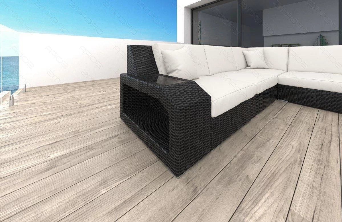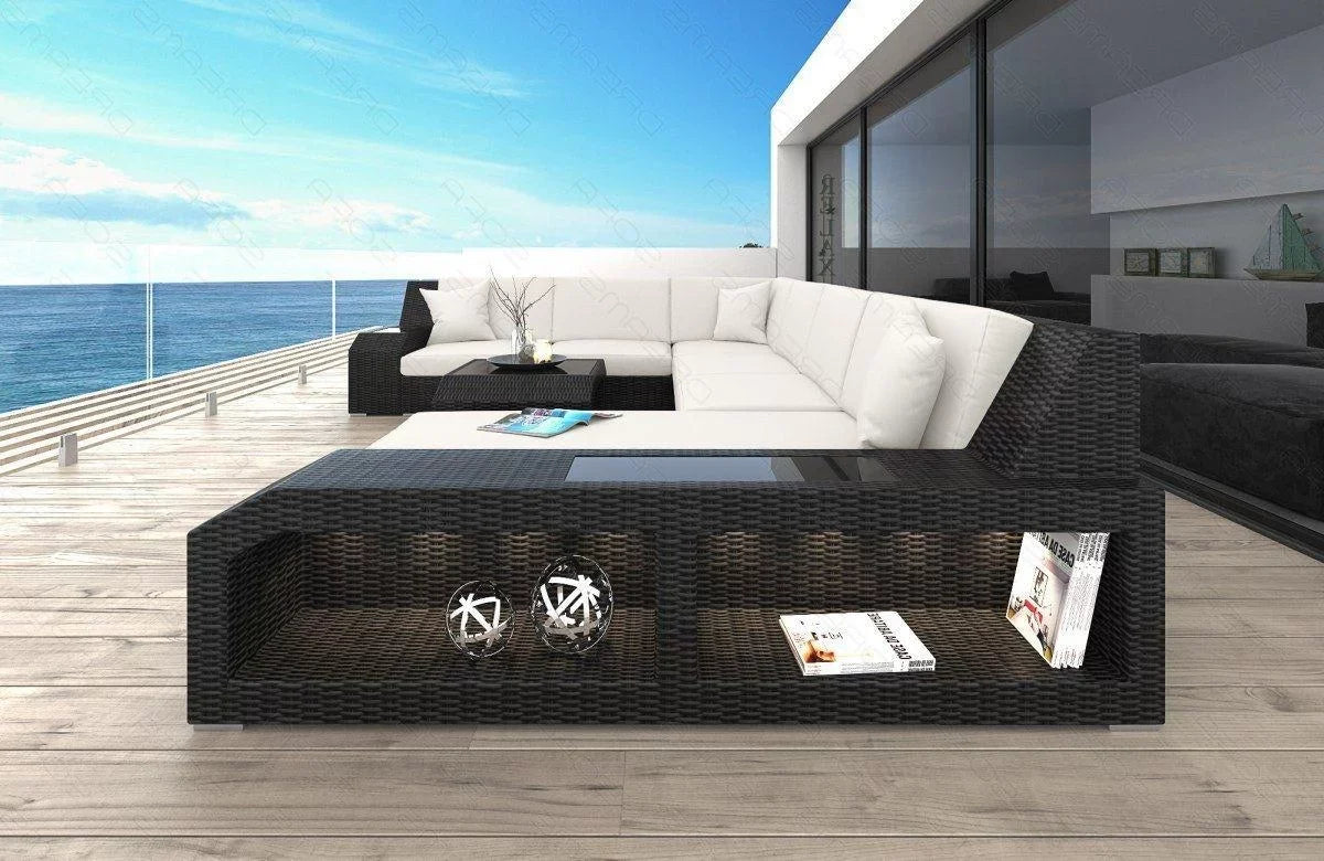 The rattan sofa Matera XXL cream consists of an aluminium frame, which is covered with a polyrattan braid. This gives the piece of furniture a light-footed look that reminds of summer, sun and sea and ensures southern flair on your terrace. A great advantage of the polyrattan used is the exceptional weather resistance of this material. Moisture cannot harm him anything else as changing temperatures. At the same time, the Matera XXL rattan sofa can also be used as a living area for your living room. Outdoors and outdoors, you benefit from the construction of the piece of furniture from various modules, which you can switch and swap as you wish. The rattan sofa has integrated LED lighting and upholstery pads in cream. This makes this piece of furniture a gaze catcher, whether on the terrace or in the living room. You will receive the rattan sofa with the lying area/ottomane on the right side (as shown).