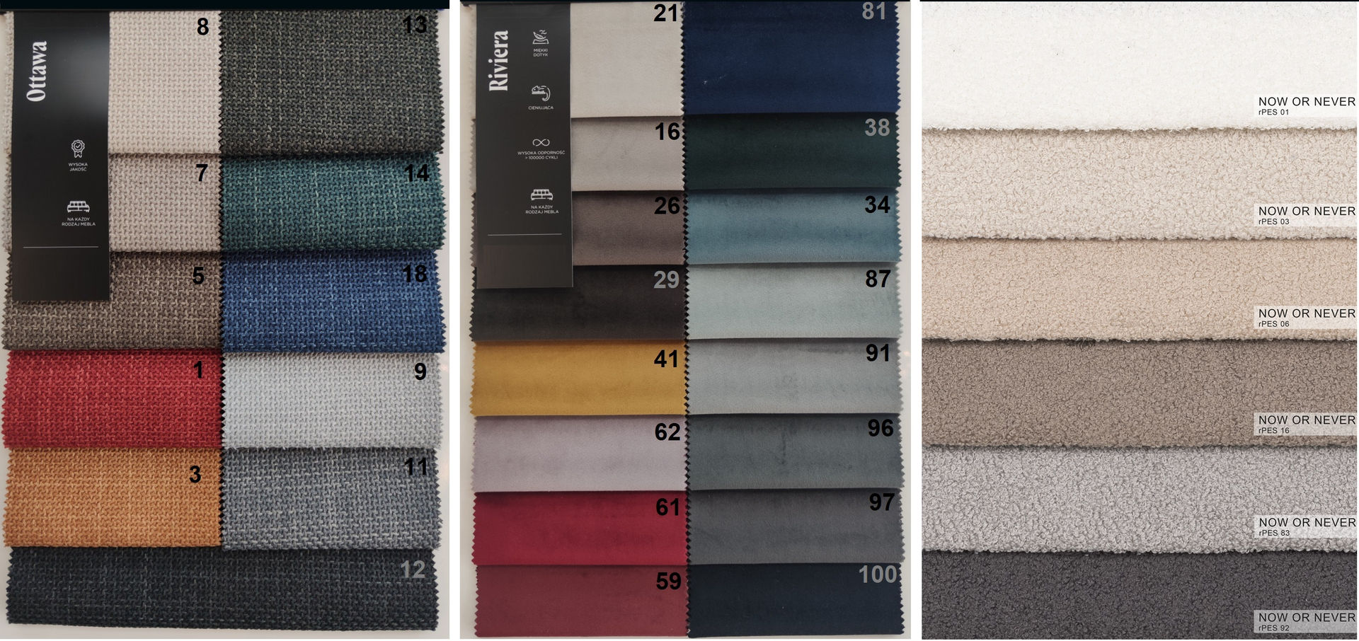 Material | Structured fabric 'Flash', velvet fabric 'Riviera Velvet' or velvet fabric 'Now or Never' - See tab 'Material and Colors' |