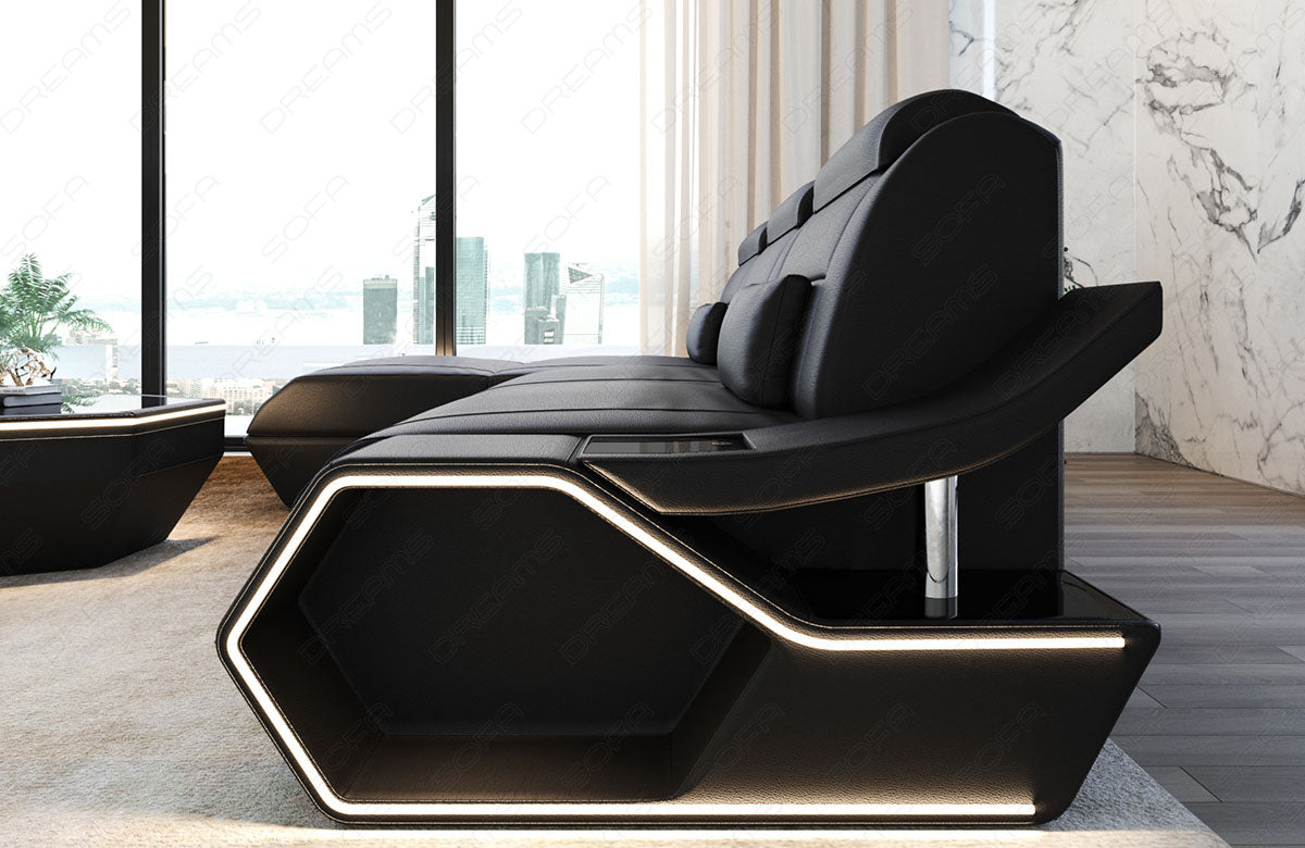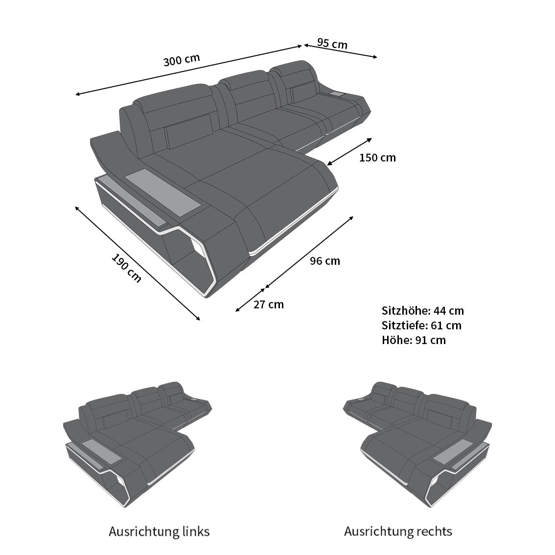 The Toscano corner sofa impresses with its modern design, which blends seamlessly into a variety of interior styles. The L-shape offers not only a generous seating area but also a comfortable ottoman that can be positioned either on the left or right – perfect for individual room concepts. The integrated LED lighting in the armrests adds stylish accents and creates a pleasant atmosphere, especially in the evenings.