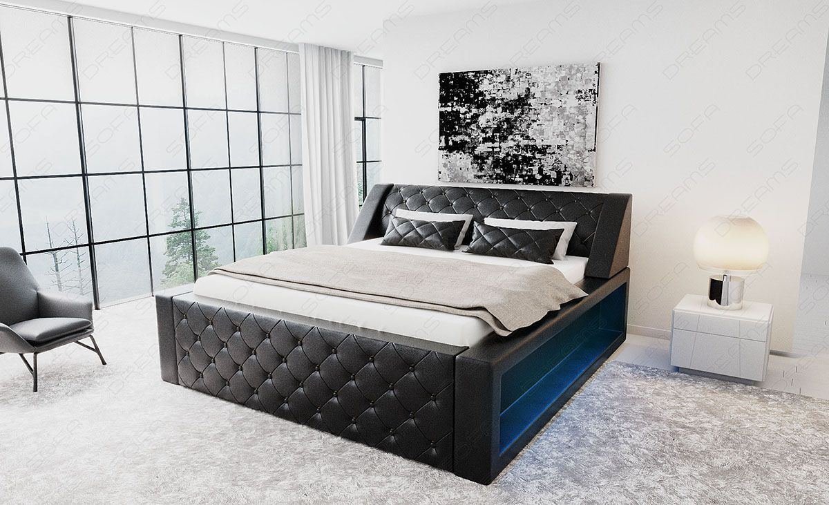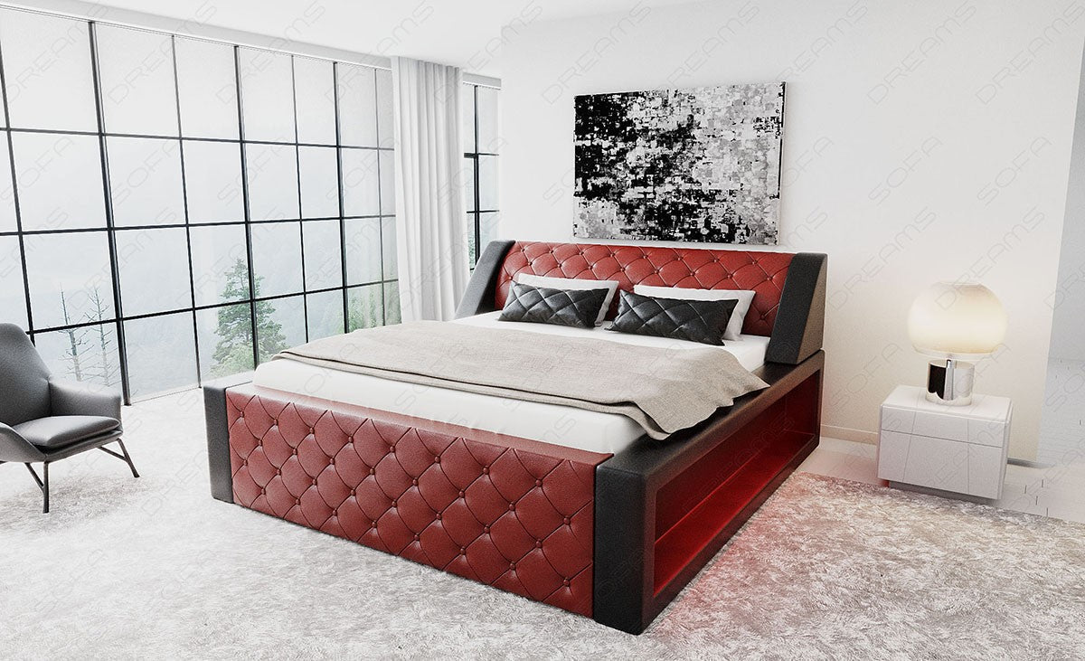 The Aroba waterbed impresses with its almost futuristic design. This is especially noticeable when you switch on the integrated white LED lighting in the side panels. This perfectly highlights the bed's unique design. The quilted headboard and the sloping sides create a striking contrast and immediately attract attention. The overall impression is rounded off by the elegant faux leather covering of the bed frame, which is both luxurious and durable.