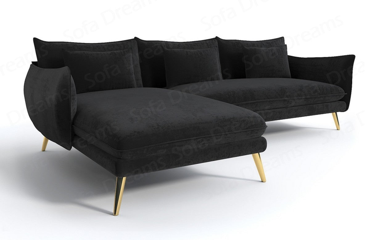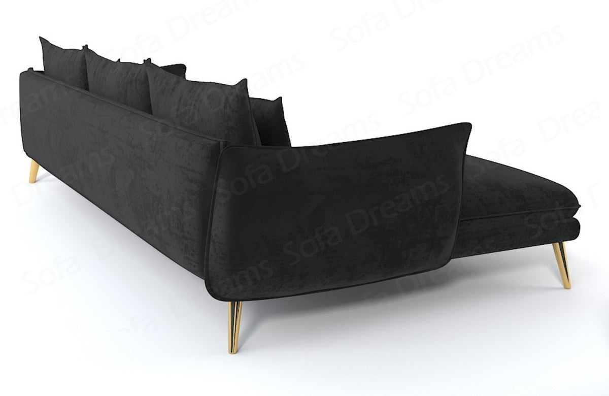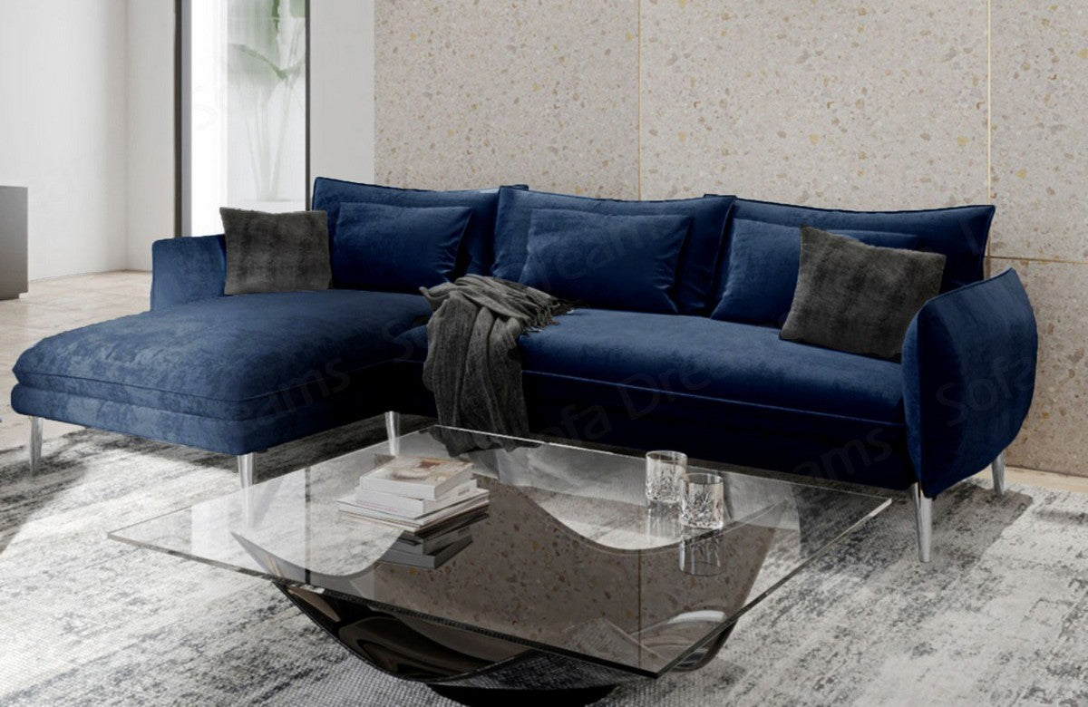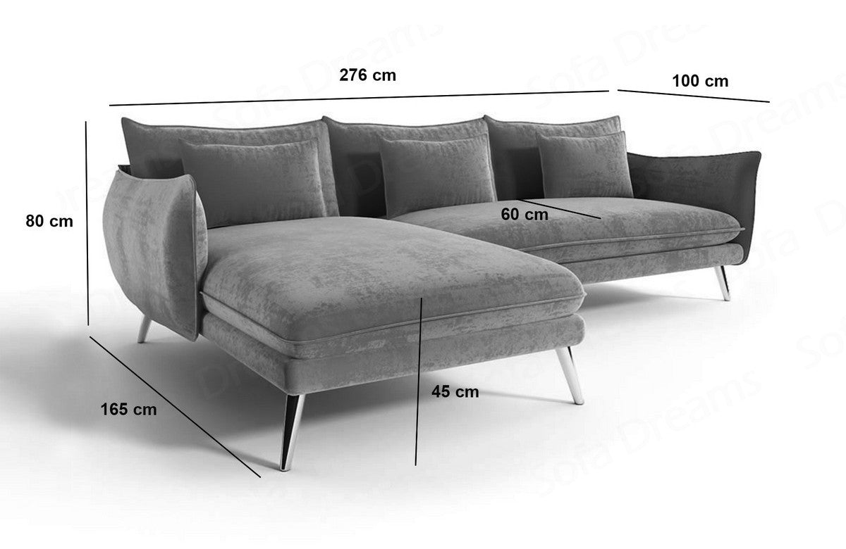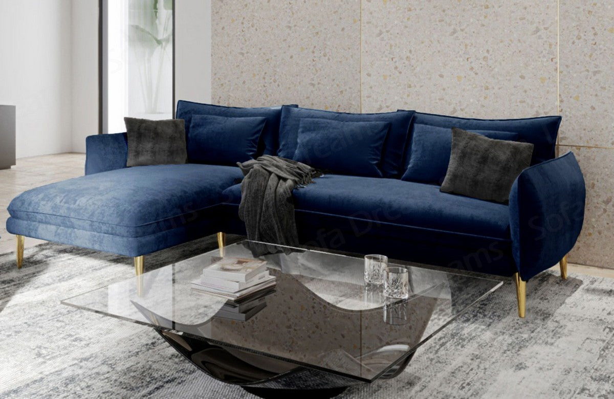 The velvet corner sofa Fuerteventura in L-shape (short) offers you an elegance corner couch with gold or silver sofa legs. It is also equipped with an ottoman, the orientation of which you can choose according to your preferences. The compact dimensions allow you to use the sofa flexibly in different room sizes. Create your own individual designer sofa according to your wishes. The first-class suspension not only ensures a high level of seating comfort, but also prevents deformation that can occur while sitting.
